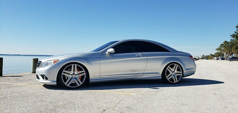 To compensate for the smaller powerplant, this CL550 received (according to the seller) a Stage 1 ECU tune (tuner unknown) with +25 HP/ 28 Torque = 400HP; 21" ML63AMG wheels wrapped in Hankook Ventus V12 Tires (21x10" wheels all around with 275/30/21 tires); Complete CL63/65 AMG Brake Conversion with professionally painted Calipers ($5,000 upgrade); Ceramic Tints (35% all around 50% on the Windshield); and a "Custom" Steering Wheel.