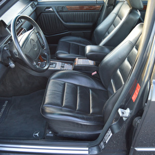 The interior is finished in Anthracite black leather with burl wood accents along the dash and doors. The car has automatic climate control and heated seats. It's worth noting the 500E's came standard with upgraded Recaro seats including split rear seats. The leather is still in great condition with no tears. Our favorite interior feature of course is the period correct vintage car phone mounted to the dash for all of those important phone calls while on your drive to your other beach house.